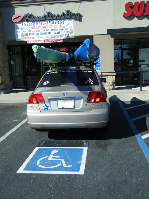 One morning on a two and half hour drive to the put in spot, we pulled off at a gas station to use the facilities and parked in the handicapped space. An older gentleman who came in after us was then "forced" to use the space two spots down right in front of the window washing station. He made a big show of putting up his handicapped placard (he wasn't in a handicapped space), making sure to send us angry glances for good measure, then proceeded to get out of his car without any mobility aids whatsoever and wash his windows and when he was finished he gave us one last dirty look before he got back into his car and drove off???